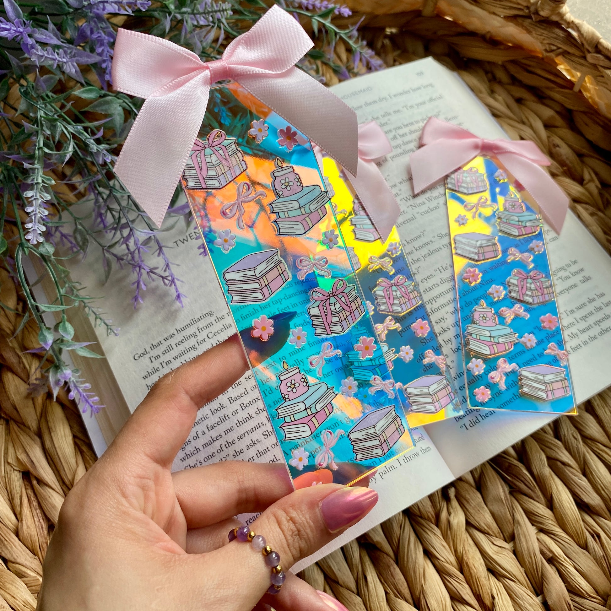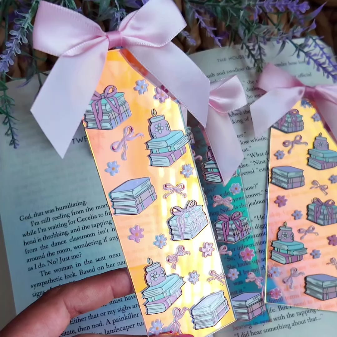 Cute Rectangle Aesthetic acrylic iridescent bookmark with pink bow. Great addition to your book collection :)