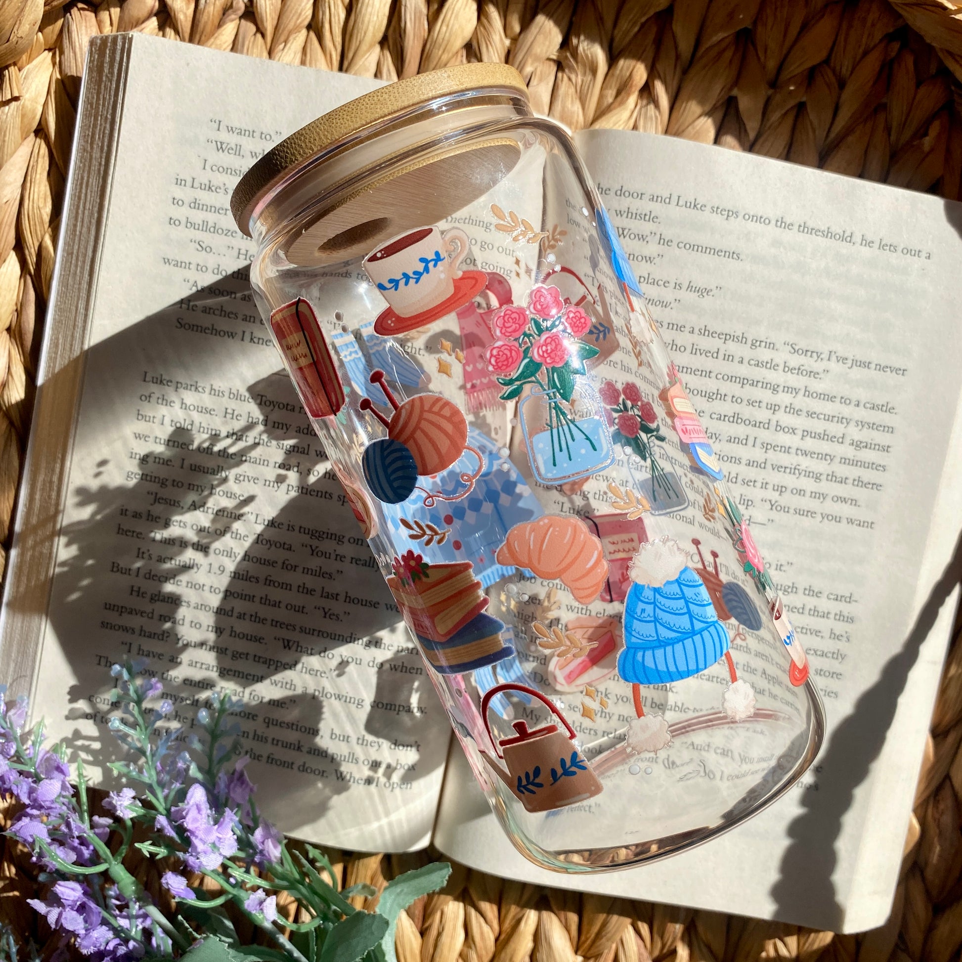 Blue bookish Holiday Christmas Glass Cup | Handmade | Unique Gift | Iced Coffee | Matcha | Simple