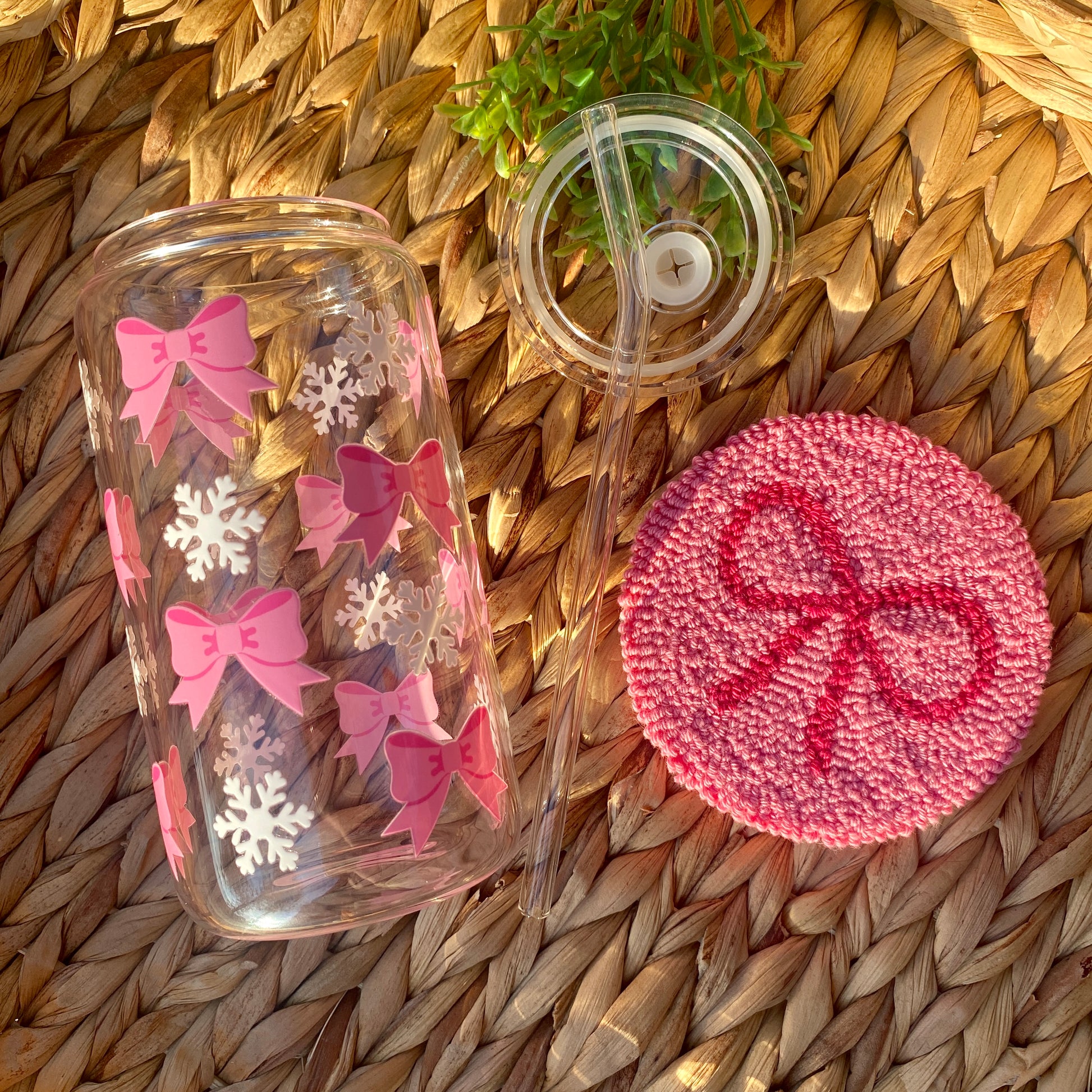 20 oz Cute Pink Bows White Snowflake Glass Cup | Punch Needle Bow coaster